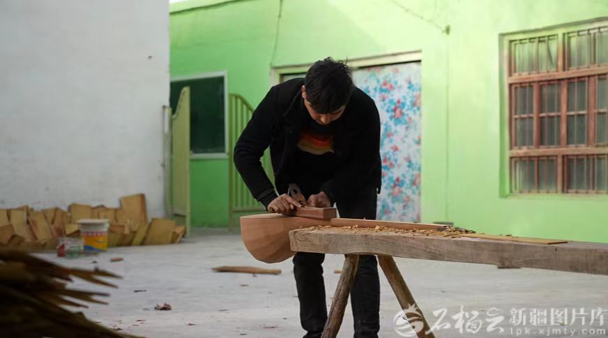 在新和縣加依村,一名村民在家里制作樂器。郭安東 攝