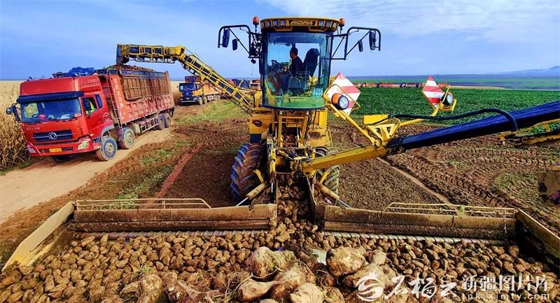 2024年11月3日,察布查爾錫伯自治縣瓊博拉鎮(zhèn)瓊博拉村禾谷種植專業(yè)合作社的甜菜種植基地里,大型農(nóng)機(jī)在田間采收甜菜,運(yùn)往糖廠。