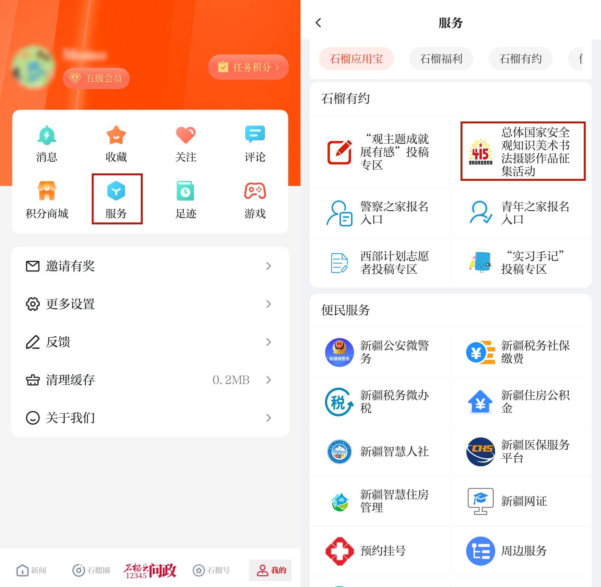 或者點(diǎn)擊【石榴云客戶端】右下角【我的】,進(jìn)入【服務(wù)】板塊,隨后下拉頁面,找到“統(tǒng)籌發(fā)展和安全 護(hù)航‘十五五’新征程”總體國家安全觀知識(shí)美術(shù)書法攝影作品征集活動(dòng)專區(qū)入口。