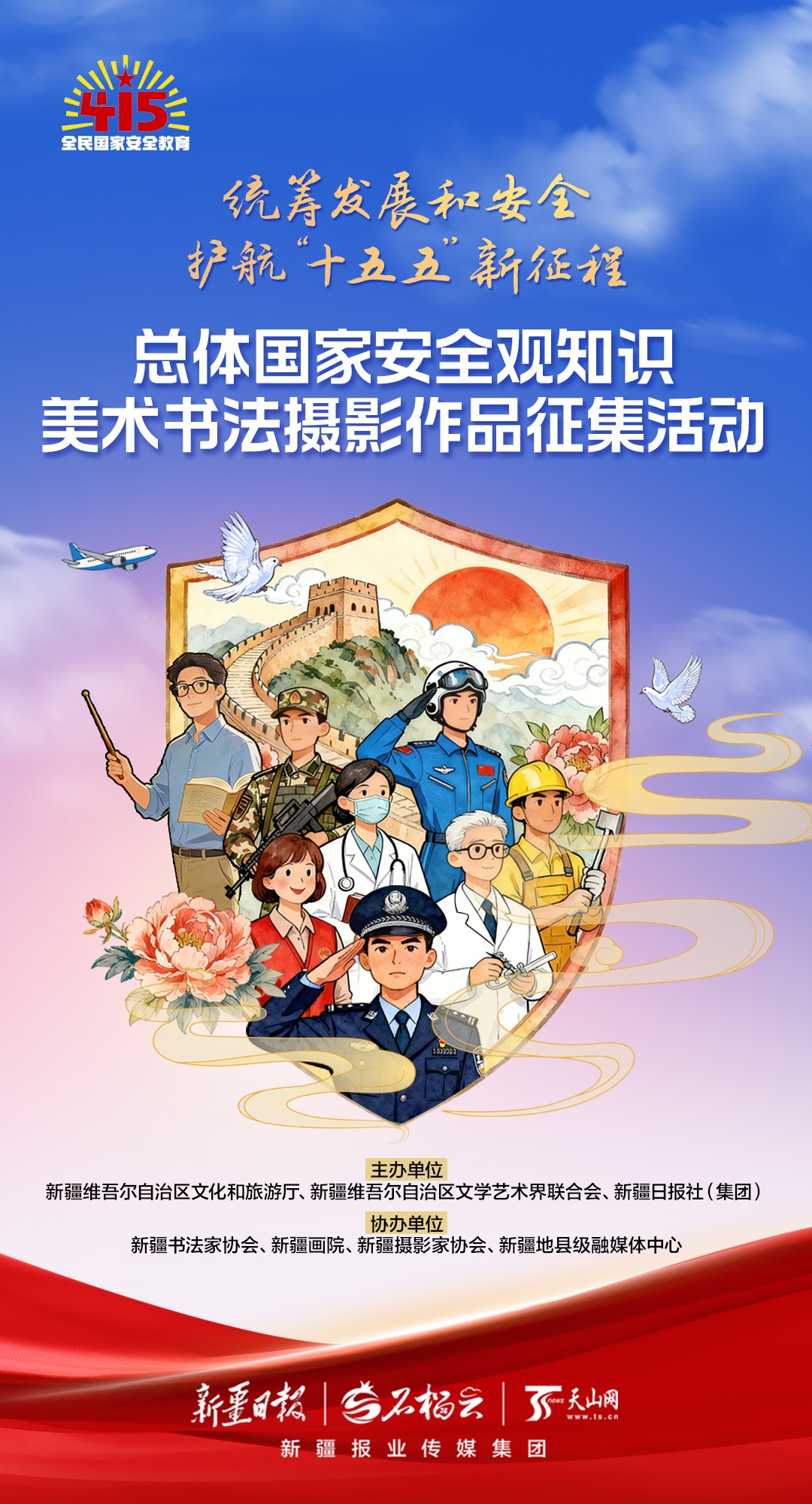 為迎接第十一個(gè)全民國家安全教育日,推動(dòng)學(xué)習(xí)貫徹總體國家安全觀走向深入,由自治區(qū)文化和旅游廳、自治區(qū)文學(xué)藝術(shù)界聯(lián)合會(huì)、新疆日?qǐng)?bào)社(集團(tuán))主辦,新疆書法家協(xié)會(huì)、新疆畫院、新疆?dāng)z影家協(xié)會(huì)、新疆地縣級(jí)融媒體中心協(xié)辦的“統(tǒng)籌發(fā)展和安全 護(hù)航‘十五五’新征程”總體國家安全觀知識(shí)美術(shù)書法攝影作品征集活動(dòng)自1月16日正式啟動(dòng)以來,得到了廣大藝術(shù)愛好者的熱烈響應(yīng)和積極投稿,截至目前已收到超700幅(組)作品,每一件作品都凝聚著創(chuàng)作者對(duì)國家安全的赤誠之心與深刻感悟。
