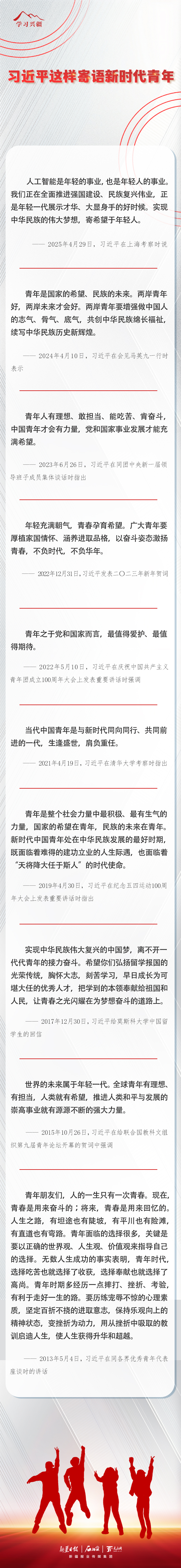 “每年五四前后,這個時間我是留給青年人的”。習近平總書記歷來重視青年工作,關心青年成長。他常走到青年中間,傾聽青年聲音,同青年交流談心,并鼓勵青年群體追求夢想、挺膺擔當。諄諄囑托、殷殷期望,激勵著廣大青年不負時代、不負韶華,在青春的賽道上接力奔跑向復興。