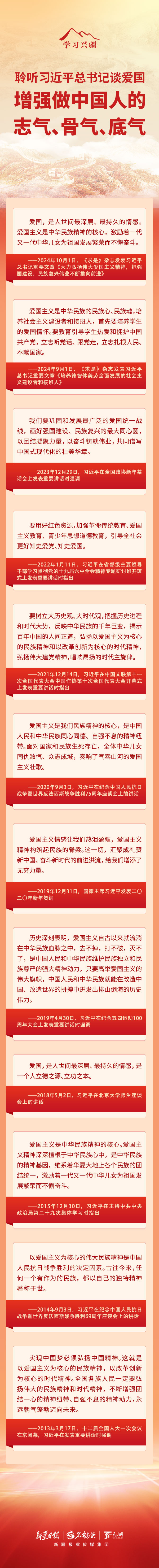 愛國,是人世間最深層、最持久的情感。愛國主義是中華民族精神的核心,激勵著一代又一代中華兒女為祖國發(fā)展繁榮而不懈奮斗。今年是中國人民抗日戰(zhàn)爭暨世界反法西斯戰(zhàn)爭勝利80周年,九三閱兵在即,讓我們重溫習(xí)近平總書記關(guān)于愛國的重要論述,不斷增強做中國人的志氣、骨氣、底氣。