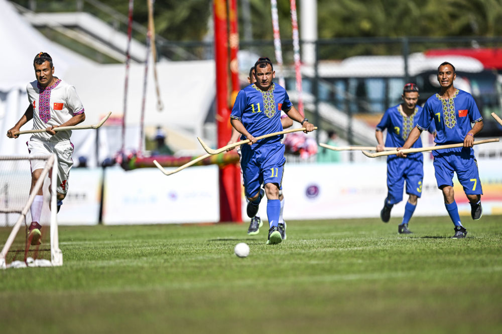 新華社三亞11月25日電(記者孫哲)頭戴維吾爾族花帽的運(yùn)動(dòng)員們靈活穿梭,用手中的木制球桿將棉線纏繞而成的球揮出一道弧線……