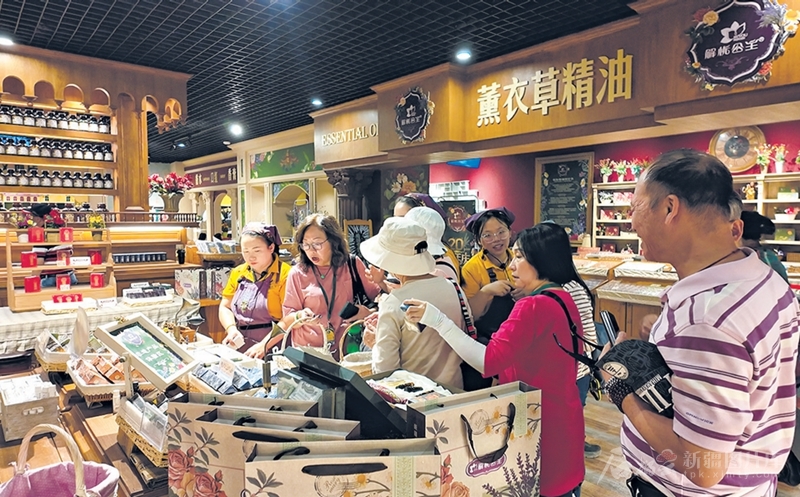 游客在霍城縣清水河鎮(zhèn)解憂公主薰衣草園薰衣草小街購(gòu)買(mǎi)產(chǎn)品(7月3日攝)。張柏年攝