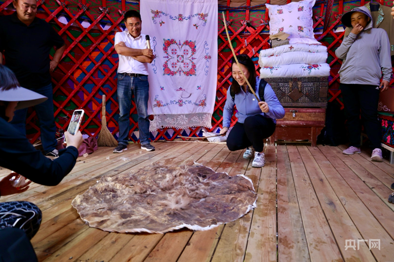 在哈薩克族特色氈房,游客體驗(yàn)打羊毛活動(dòng)(央廣網(wǎng)記者 梁瑜琳 攝)