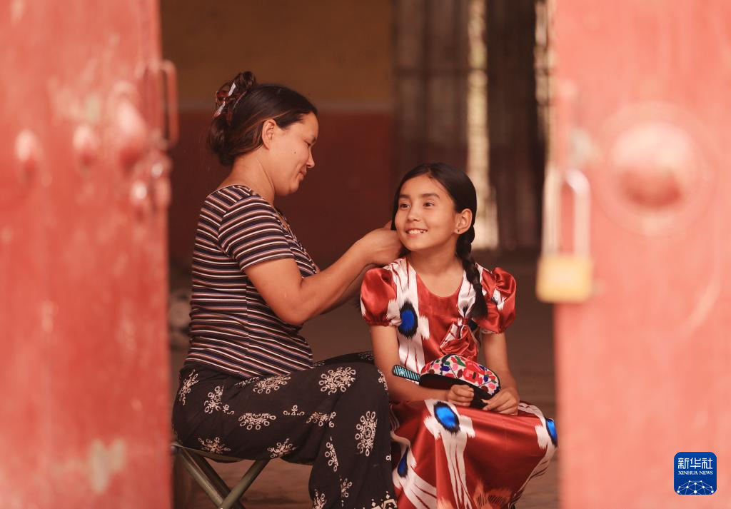 7月23日,在新疆和田策勒縣渠勒村,帕提曼罕·排日海提的媽媽教她編辮子。媽媽一邊教,一邊念叨:“要去北京啦,得把自己收拾得漂漂亮亮的。”新華社記者 郭燕 攝