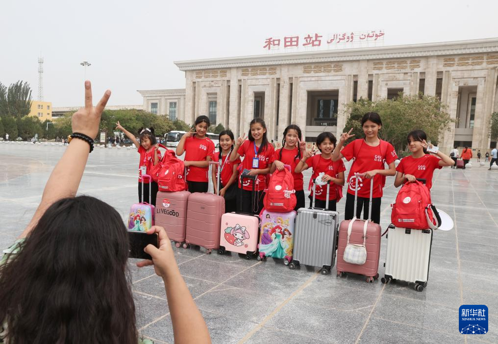 7月25日,帕提曼罕·排日海提(左三)和小伙伴們在和田火車站前留影,她們即將乘坐開往烏魯木齊的列車。新華社記者 郭燕 攝
