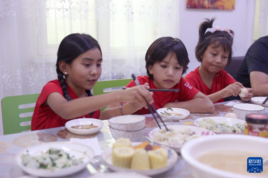 7月25日,位于新疆和田地區(qū)策勒縣亞博依村國網(wǎng)新疆電力有限公司駐策勒縣工作隊的食堂里,帕提曼罕·排日海提(左)和小伙伴們在吃叔叔阿姨們一大早包好的送行餃子。新華社記者 郭燕 攝