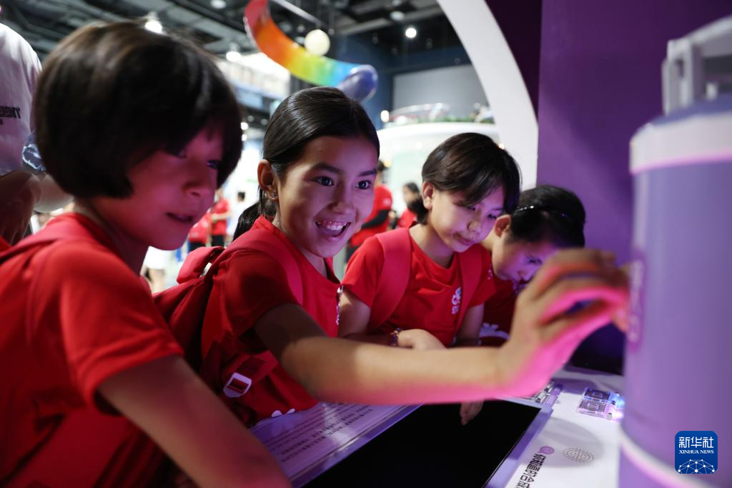 7月29日,帕提曼罕·排日海提(左二)和小伙伴在北京中國科學技術館參觀體驗。新華社發(fā)(張利民 攝)
