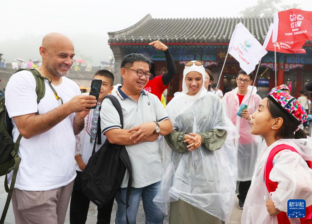7月28日,在北京八達嶺長城,帕提曼罕·排日海提(右)和游客互動,邀請大家去新疆旅游。新華社發(fā)(張利民 攝)
