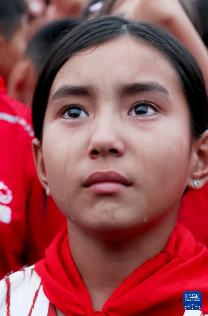 7月31日,帕提曼罕·排日海提第一次在天安門廣場觀看升旗儀式,激動的淚水淌過臉頰。新華社發(fā)(張利民 攝)