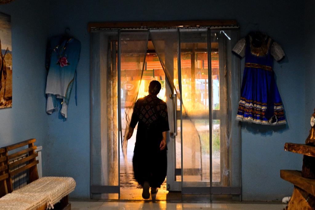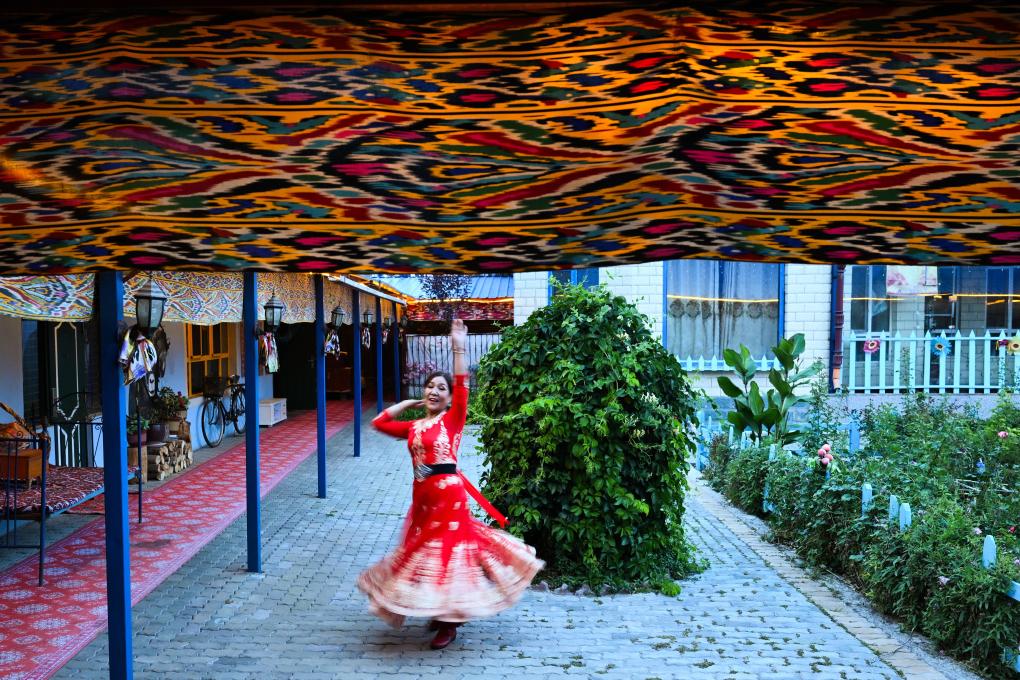 9月17日,哈薩克族客人庫(kù)爾加娜在院中跳舞。