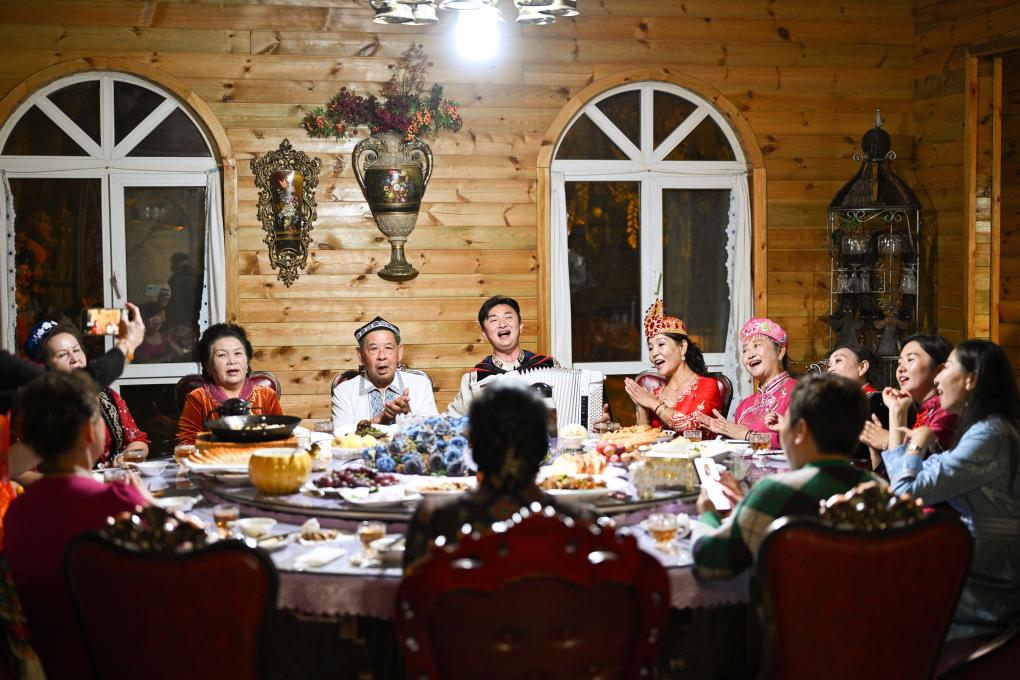 9月17日,哈薩克族客人哈加依甫·也克斯?jié)h在餐后拉起手風(fēng)琴,人們隨琴聲起舞。
