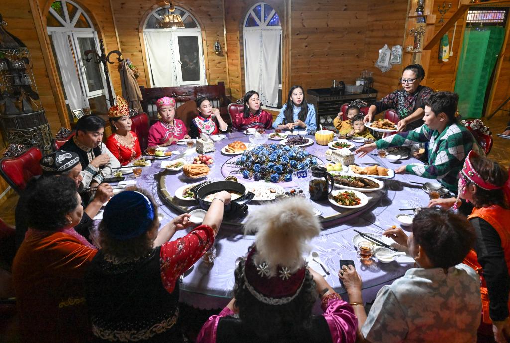 9月17日,達(dá)斡爾族客人宋瑞琪在餐后跳舞。