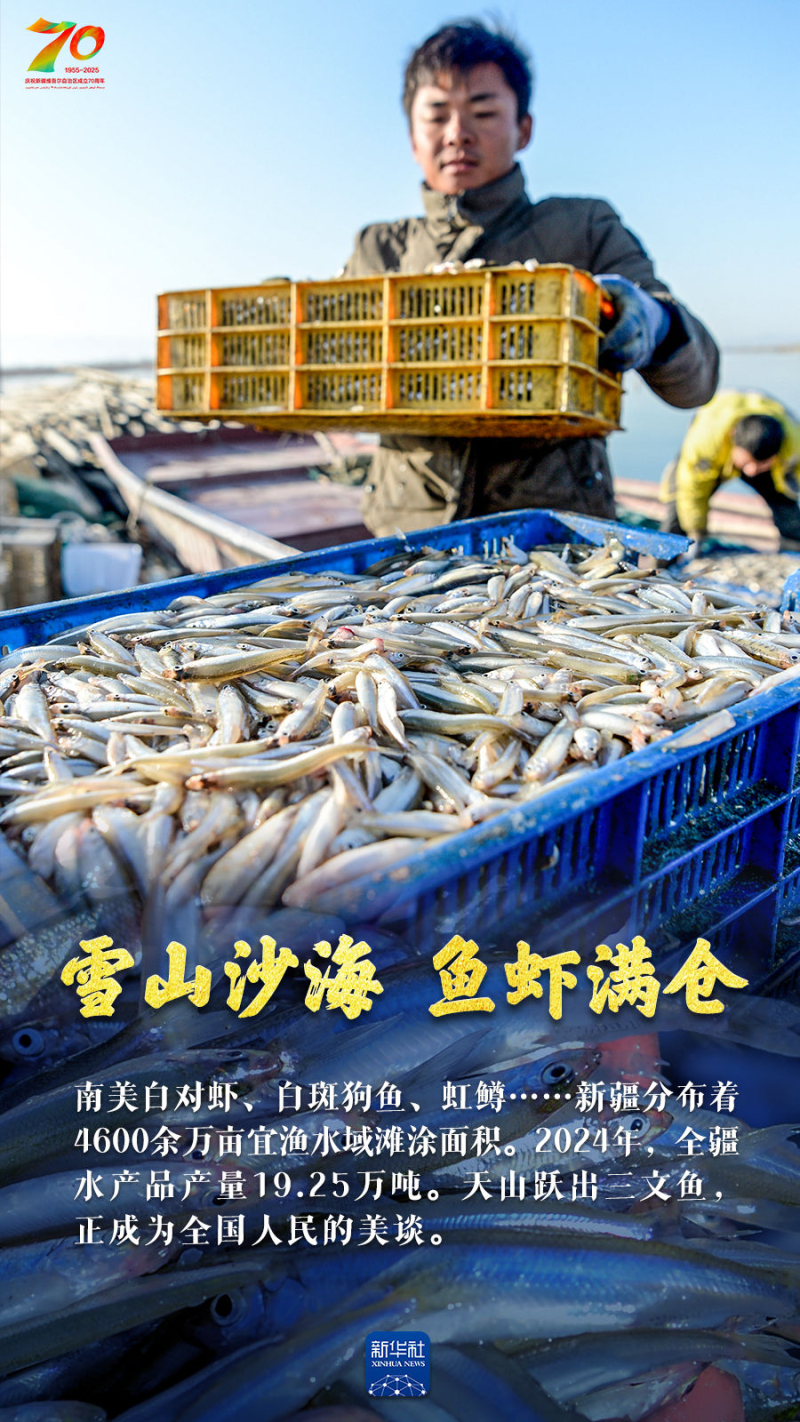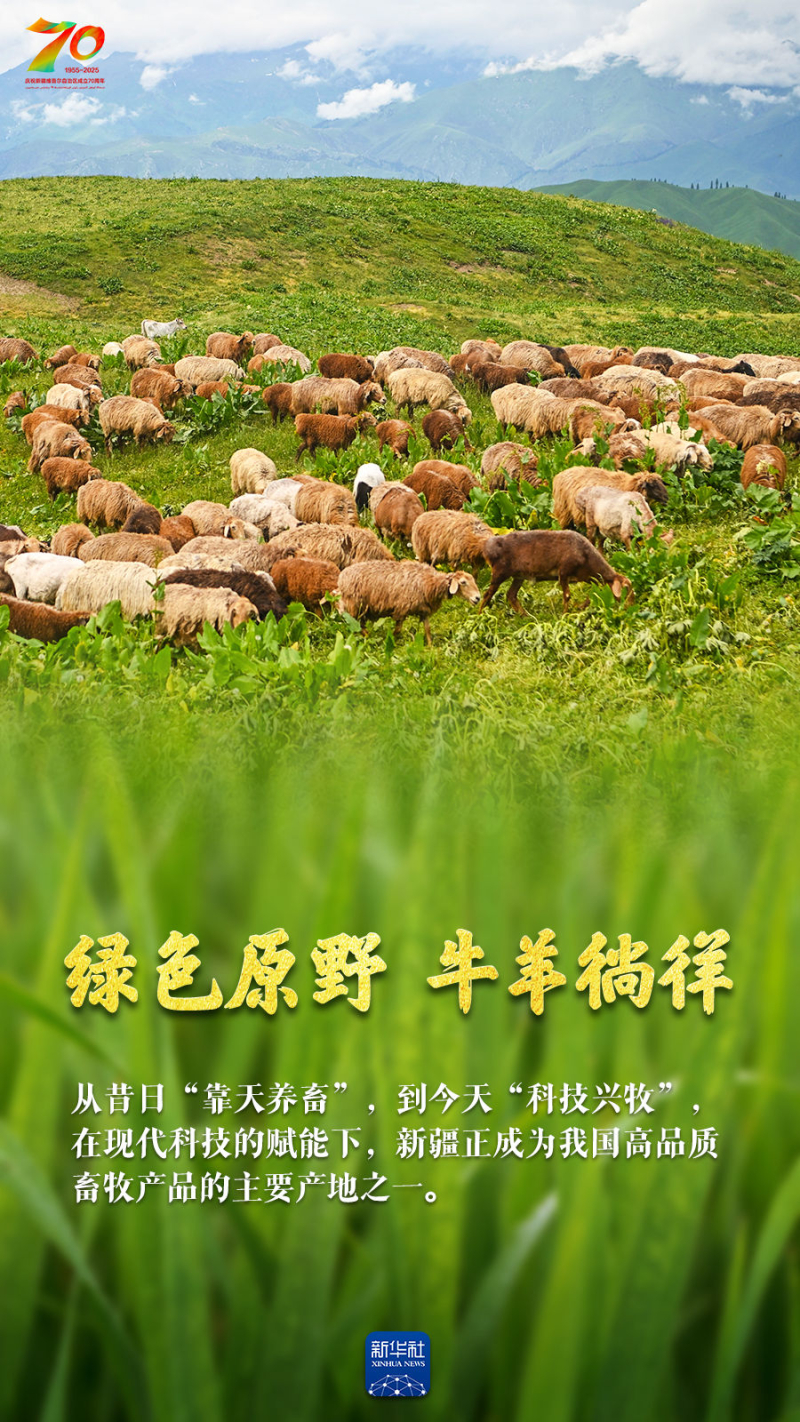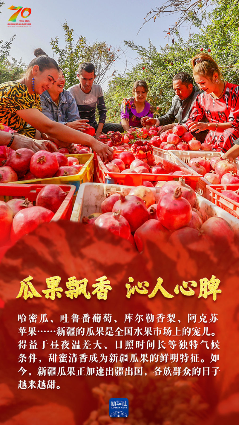正是豐收好光景,天山南北倉廩實(shí)。今年是新疆維吾爾自治區(qū)成立70周年,70年來新疆農(nóng)業(yè)生產(chǎn)發(fā)生了翻天覆地的變化:人均口糧從不足200公斤到糧食單產(chǎn)躍居全國第一;棉花占全國總產(chǎn)量的比重超過九成;離海最遠(yuǎn)的新疆成為多種海鮮出口地;皮亞曼的石榴、吐魯番的葡萄、庫爾勒的香梨、阿克蘇的蘋果……更是甜醉了全國人民的味蕾。讓我們跟隨這組海報(bào),領(lǐng)略豐收里的大美新疆。