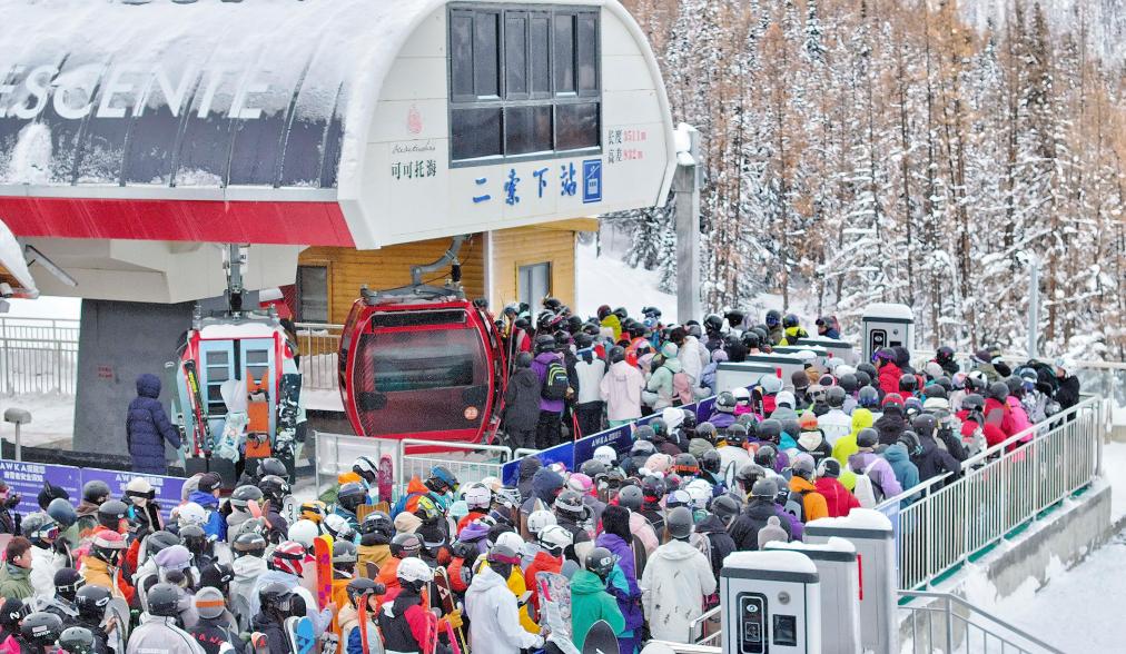 2024年11月,游客在可可托海國際滑雪度假區(qū)排隊等候乘坐纜車。新華社記者 胡虎虎 攝
