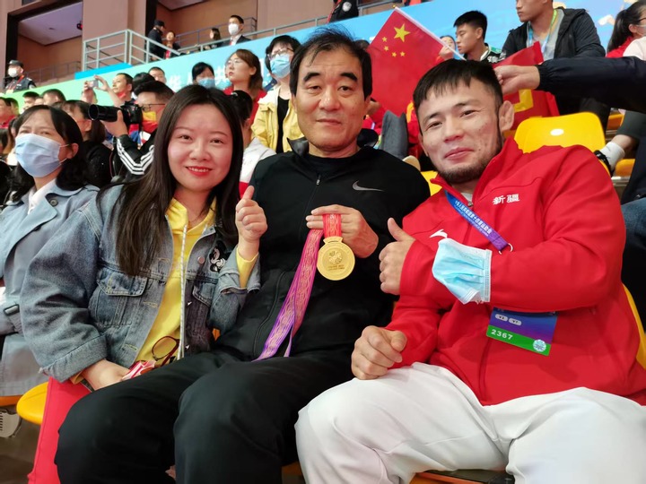2021年陜西全運會期間,劉泳太(中)與奪得金牌的弟子托爾巴圖(右)合影。