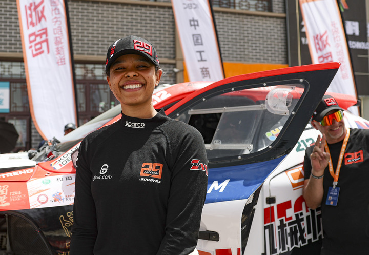 今年5月,阿莉亞在環(huán)塔拉力賽發(fā)車儀式上。新華社記者 胡星宇 攝
