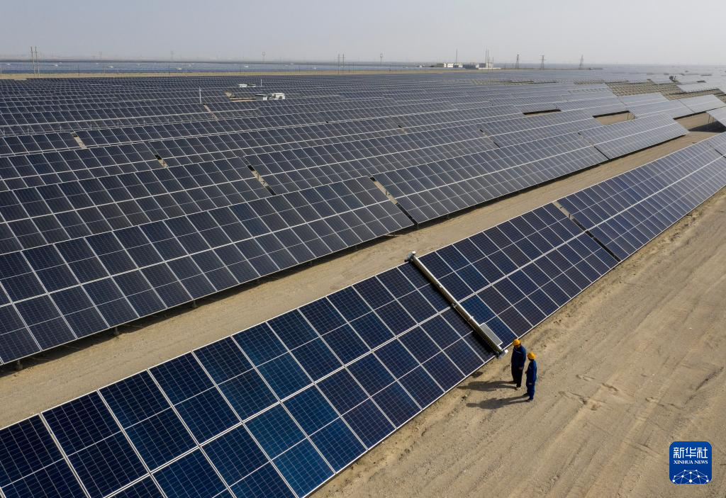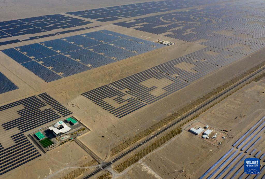 9月22日在新疆巴音郭楞蒙古自治州若羌縣拍攝的中國綠發(fā)新疆中綠電若羌400萬千瓦光伏項(xiàng)目(無人機(jī)照片)。該項(xiàng)目每年可發(fā)電69.08億千瓦時(shí),滿足南疆200萬戶家庭用電需求。新華社記者 陳朔 攝