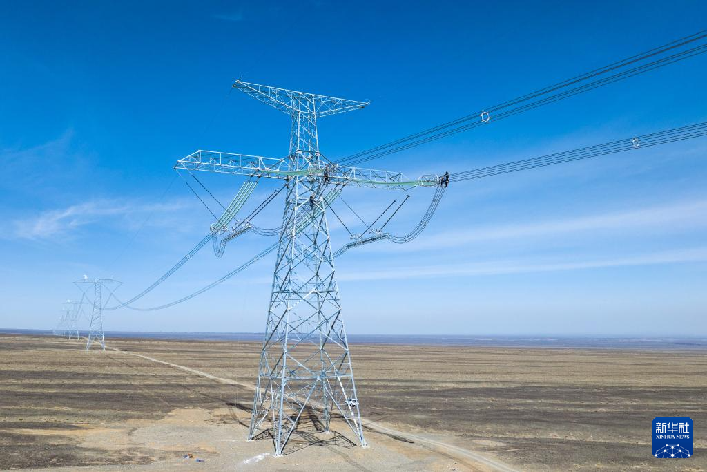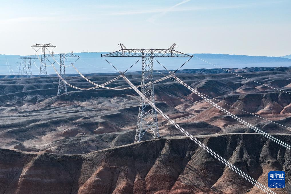 矗立在戈壁上的±800千伏哈密—重慶特高壓直流輸電線路工程(4月8日攝,無人機(jī)照片)。新華社發(fā)(張靈軍 攝)
