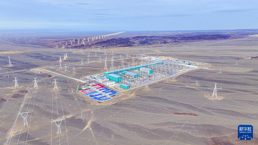 9月22日在新疆巴音郭楞蒙古自治州若羌縣拍攝的三峽集團(tuán)“疆電外送”第四通道電源項(xiàng)目施工現(xiàn)場(無人機(jī)照片)。新華社記者 陳朔 攝