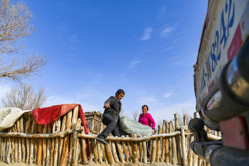 依明·買提庫爾班(前)和妻子抬著行李跨出老家的籬笆墻,準備乘車前往安置點(2019年11月17日攝)。