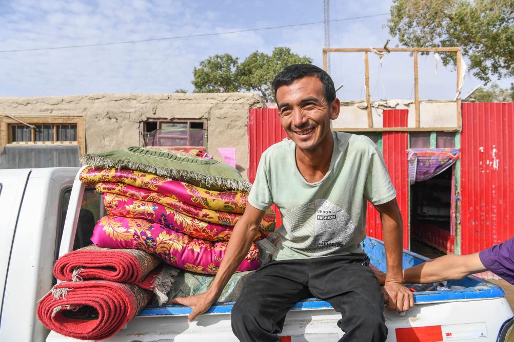 在新疆于田縣達里雅布依鄉(xiāng)政府駐地附近的村莊,村民熱和買提·買買提明在幫助該鄉(xiāng)首批易地搬遷貧困戶轉(zhuǎn)運行李(2018年9月5日攝)。