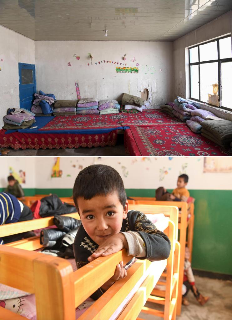 拼版照片:上圖為易地扶貧搬遷前的于田縣達里雅布依鄉(xiāng)學(xué)校學(xué)生宿舍(2018年9月5日攝);下圖為5歲的阿不都沙拉木·庫爾班在新學(xué)校午休(2019年11月19日攝)。