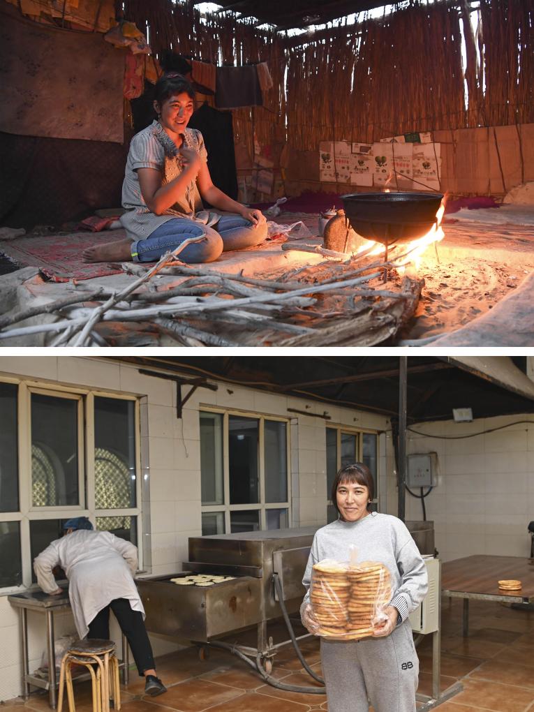 拼版照片:上圖為搬遷前,達里雅布依村村民古麗巴哈爾·阿不都拉在家中做飯(2018年9月4日攝);下圖為古麗巴哈爾·阿不都拉在于田縣的一家打馕店上班(2024年11月11日攝)。