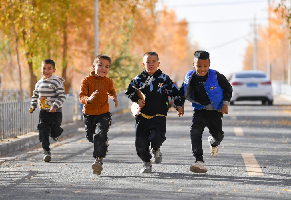 小朋友奔跑在新疆于田縣達里雅布依新村(2024年11月9日攝)。