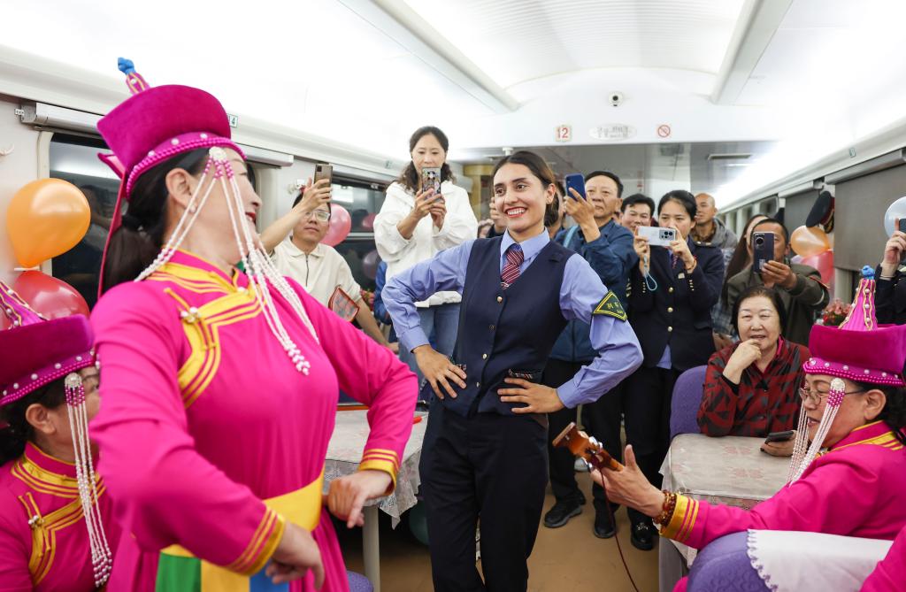 在由喀什開往成都西的列車上,艾爾開牙·多力開與民間藝人一起為乘客跳舞(2024年4月19日攝)。