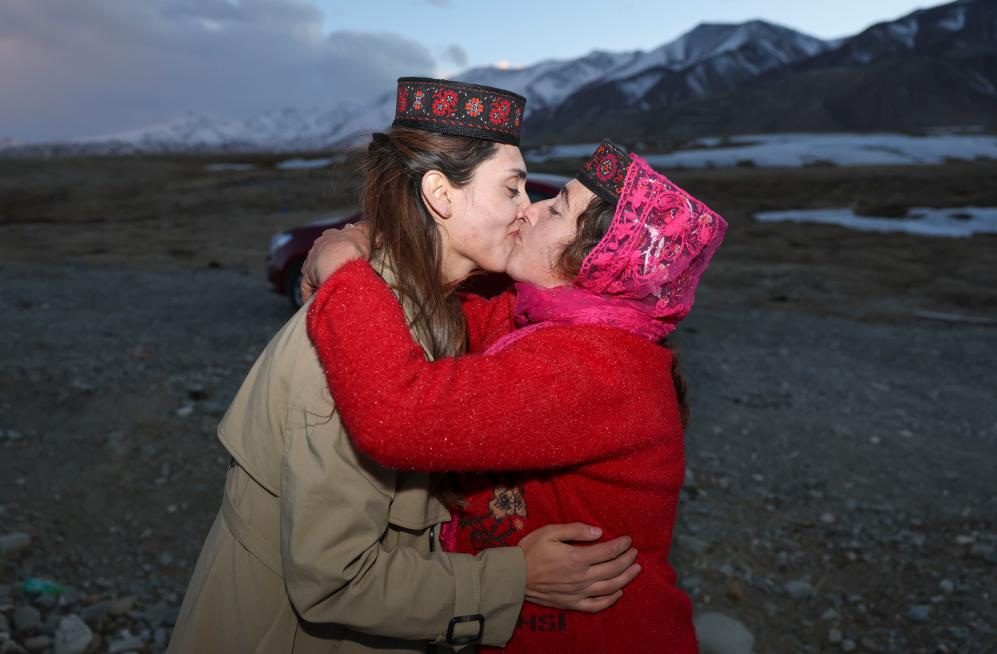 在新疆塔什庫爾干塔吉克自治縣瓦恰鄉(xiāng)夏布孜喀拉村,一位長輩(右)和艾爾開牙·多力開告別(2024年3月22日攝)。