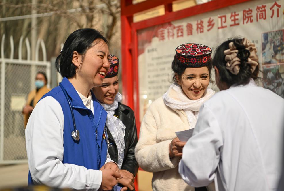 在新疆塔縣庫科西魯格鄉(xiāng)衛(wèi)生院,深圳援疆新生兒科醫(yī)生潘千(左一)與村民、鄉(xiāng)衛(wèi)生院醫(yī)護人員交流(2025年3月24日攝)。