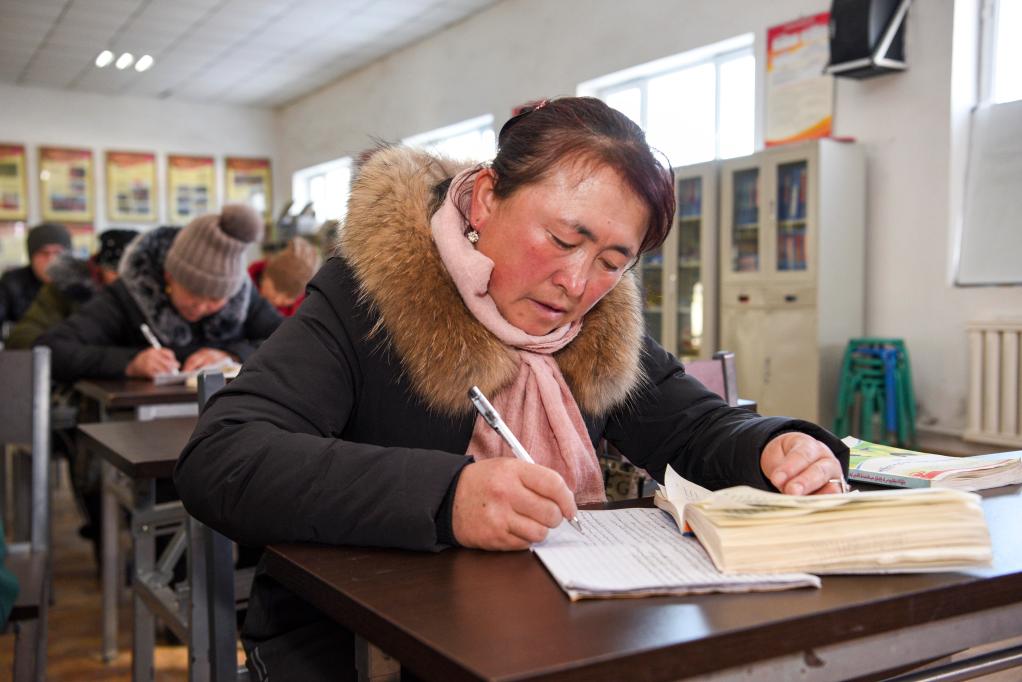 在新疆農(nóng)業(yè)廣播電視學(xué)校昭蘇縣分校巴爾格勒津村教學(xué)點,42歲的牧民古力巴哈提·斯拉木霍加在復(fù)習(xí)動物衛(wèi)生防疫技術(shù)課的知識點(2018年1月22日攝)。2019年4月,她和班上的44名同學(xué)將拿到畜牧獸醫(yī)專業(yè)的中專畢業(yè)證,有望得到新的就業(yè)機會。