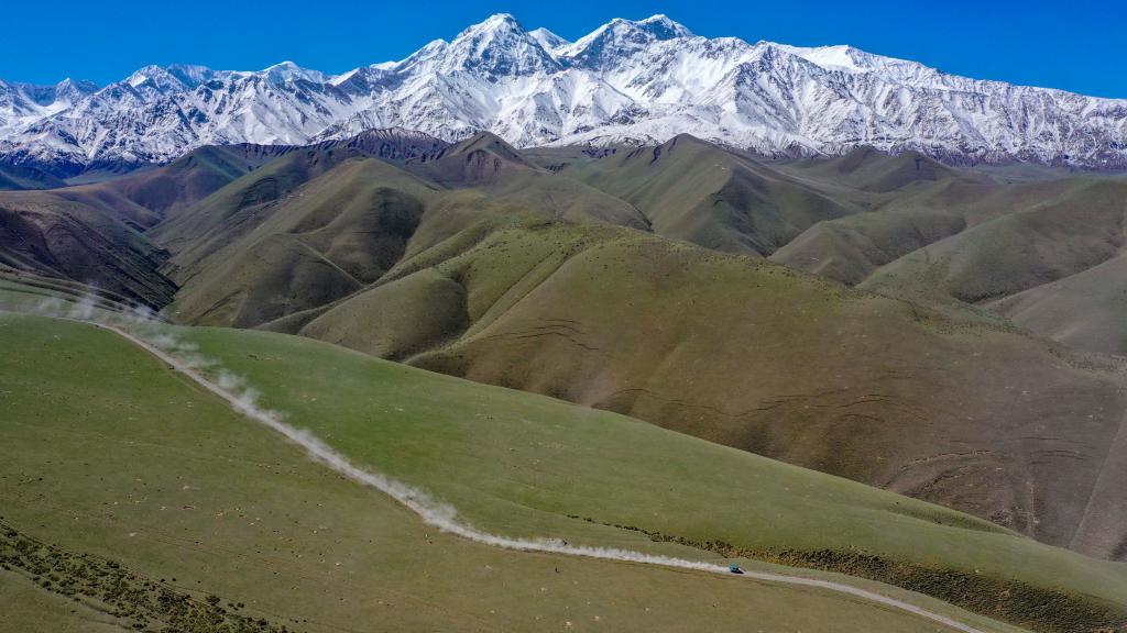 汽車疾馳在位于昆侖山北麓的新疆策勒縣一處高山牧場道路上(2019年5月31日攝,無人機照片)。近年來,新疆偏遠牧區(qū)的出行條件得到改善。