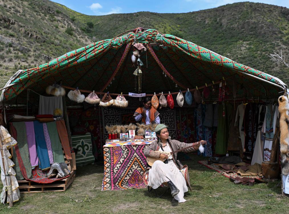 在烏魯木齊市水磨溝區(qū)的“夏牧場·游牧文化旅游節(jié)”上,北京姑娘周方怡(前)在展廳前彈奏冬不拉,她的“游牧”文創(chuàng)搭檔扎伊拉·也斯達吾列提在身后準備展品(2024年6月15日攝)。