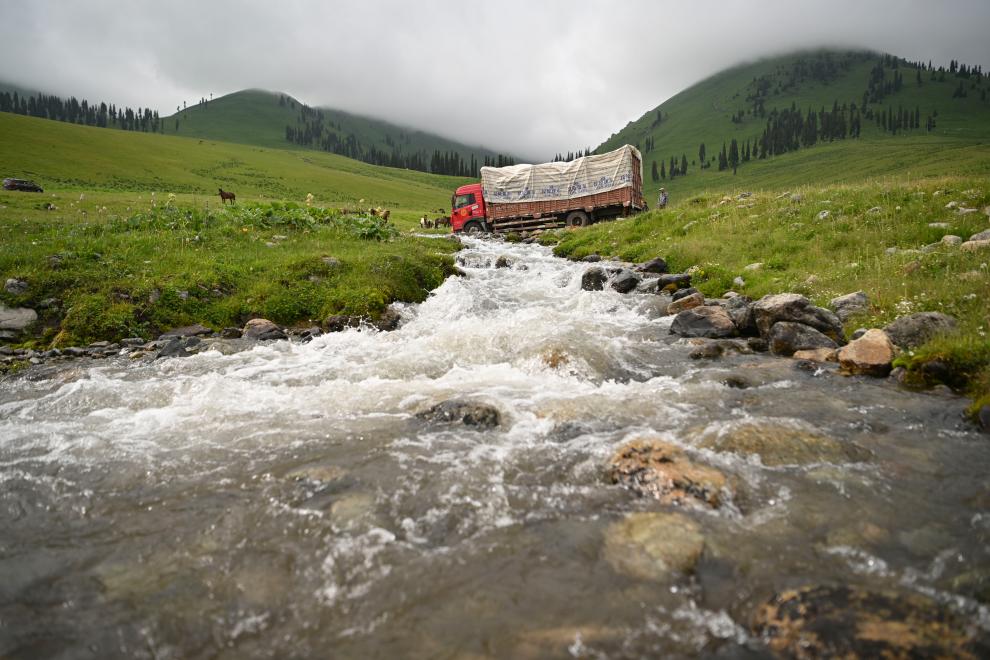 進行機械化轉(zhuǎn)場的牧民開車行駛在新疆那拉提草原深處(2025年6月11日攝)。