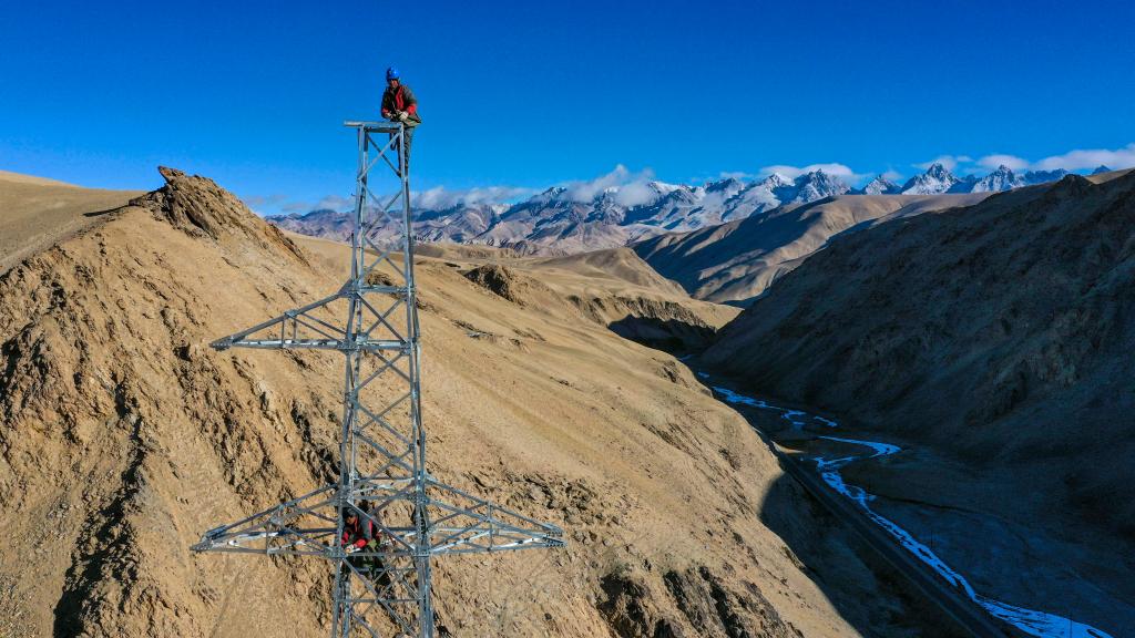 電力工人在新疆塔什庫爾干塔吉克自治縣的深山中安裝用于放線的零件(2019年11月23日攝)。