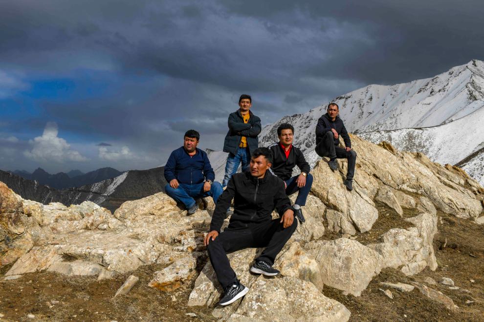 翻越雪山達坂后,參與新疆全民免費體檢服務(wù)的部分西合休鄉(xiāng)衛(wèi)生院醫(yī)護人員在山中休息時合影(2020年5月2日攝)。