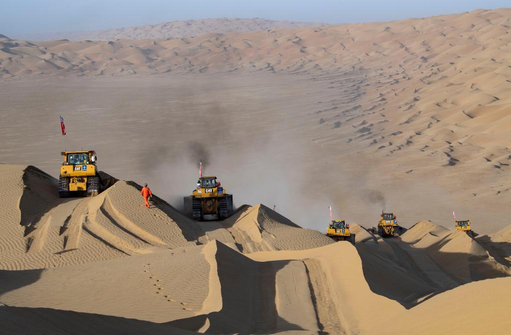 在新疆尉犁至且末沙漠公路建設(shè)現(xiàn)場,工人李明友爬過沙丘觀察推土機作業(yè)進展(2020年5月16日攝)。