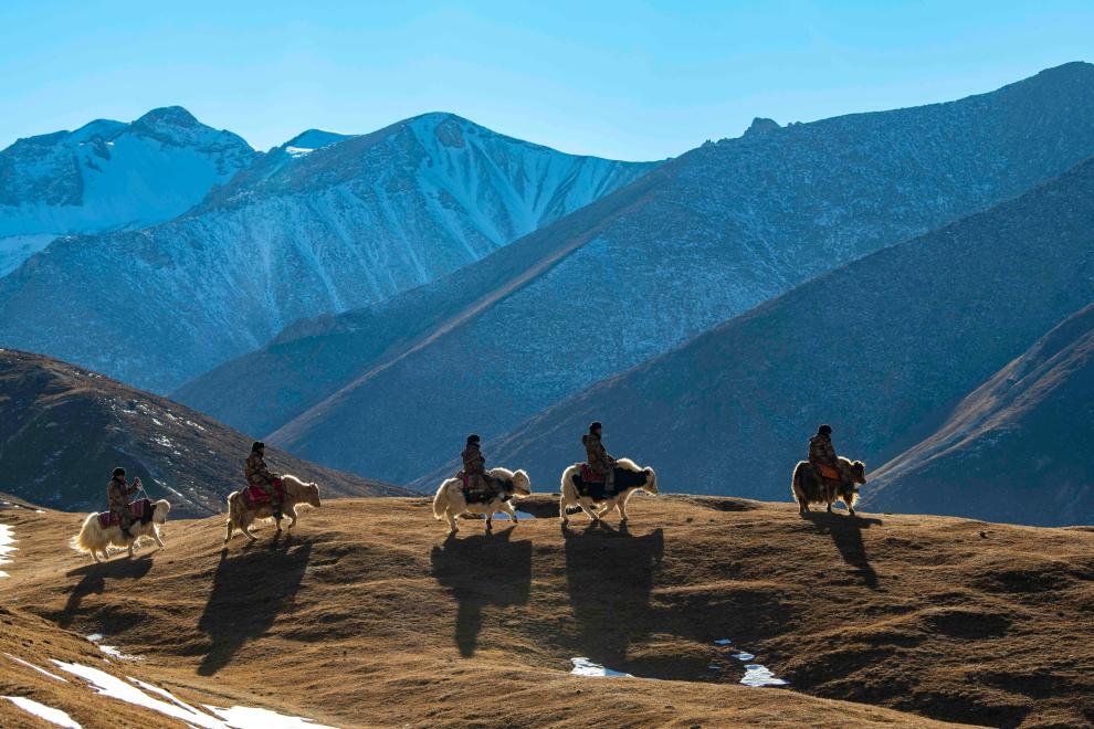 新疆生產(chǎn)建設(shè)兵團第三師圖木舒克市葉城二牧場三連的干部職工騎著牦牛行進在巡邊路上(2020年12月25日攝)。