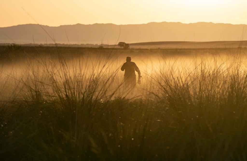新疆新源縣別斯托別鄉(xiāng)恰普河加嘠村村民在那拉提草原深處噴灑除毒害草藥劑(2018年5月26日攝)。