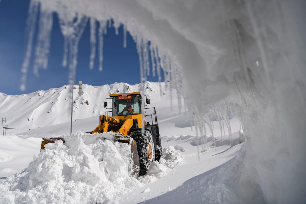 烏蘭薩德克養(yǎng)護站工人烏斯曼·巴克駕駛裝載機在獨庫公路的雪崩多發(fā)路段上清雪(2023年5月9日攝)。