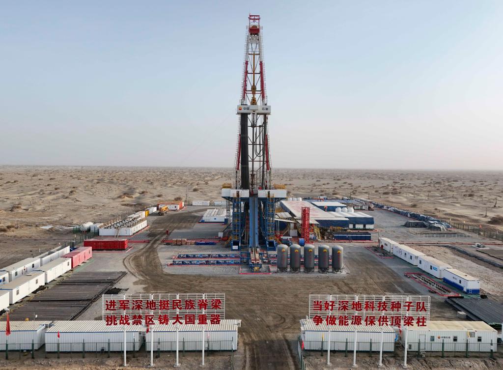 這是2025年2月20日在新疆塔克拉瑪干沙漠腹地拍攝的中國石油塔里木油田深地塔科1井。當日,我國首口超萬米科探井勝利完鉆。
