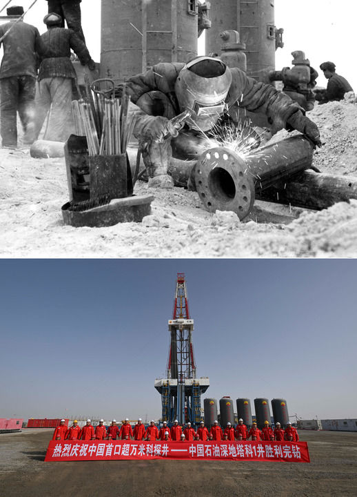 拼版照片:上圖為1959年,新疆克拉瑪依油田工人在建設(shè)九號(hào)集油區(qū)(新華社記者 武純展 攝);下圖為2025年2月20日,中國(guó)石油塔里木油田深地塔科1井現(xiàn)場(chǎng)工作人員慶祝完鉆。(新華社記者 胡虎虎 攝)
