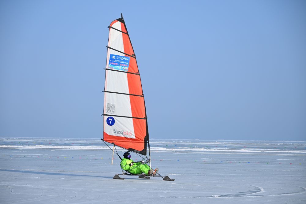 博斯騰湖冰原,參賽選手進(jìn)行冰帆比賽。新華社發(fā)(孫浩天攝)