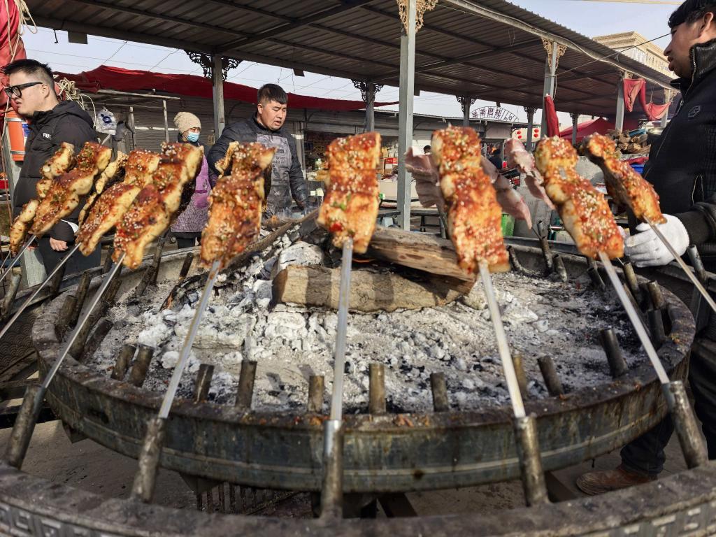 這是2月15日在喀什牛羊大巴扎上拍攝的售賣(mài)中的烤魚(yú)。新華社記者 蔡國(guó)棟 攝