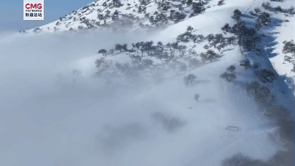 雪后山谷潔白靜謐,高低起伏的杏樹林在積雪覆蓋下輪廓分明。流動(dòng)的云霧時(shí)而輕撫林間,時(shí)而漫過(guò)山崗,使遠(yuǎn)山近樹虛實(shí)相生。