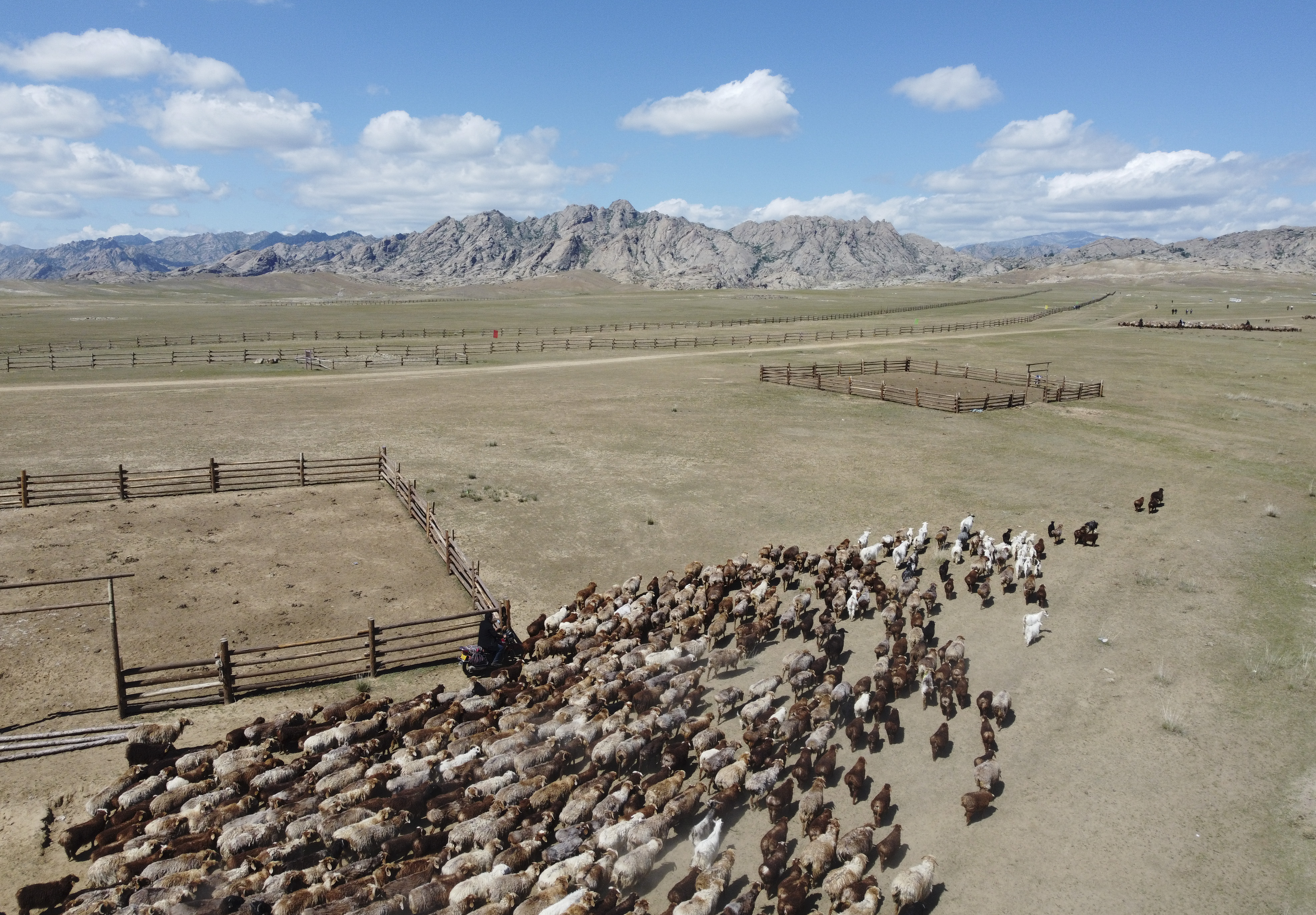 6月3日在新疆阿勒泰地區(qū)福??h沙爾布拉克旅游小鎮(zhèn)拍攝的牧場羊群遷徙(無人機(jī)照片)。新華社記者 張雨陽 攝