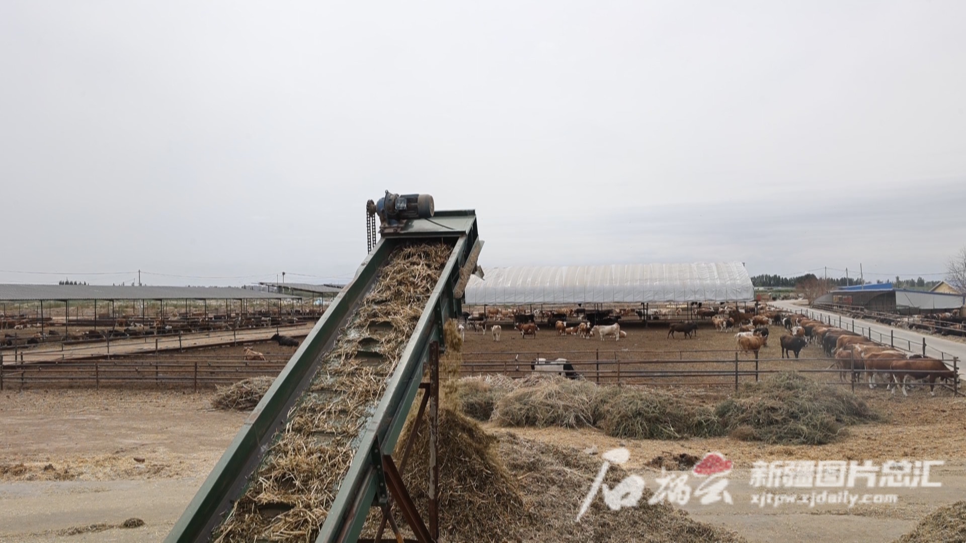 新疆澳洋畜牧科技有限責(zé)任公司牛舍旁正在準(zhǔn)備飼草料。